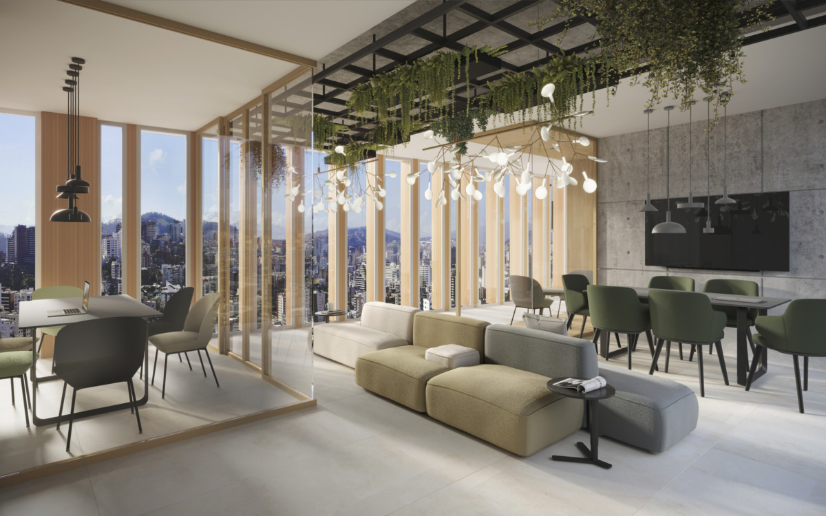 Qanvas es un edificio de 24 pisos en el centro financiero de Quito, diseñado por Diez + Muller, que ofrece oficinas y departamentos con una fachada innovadora y un jardín vertical, brindando vistas panorámicas de la ciudad y sus alrededores.
